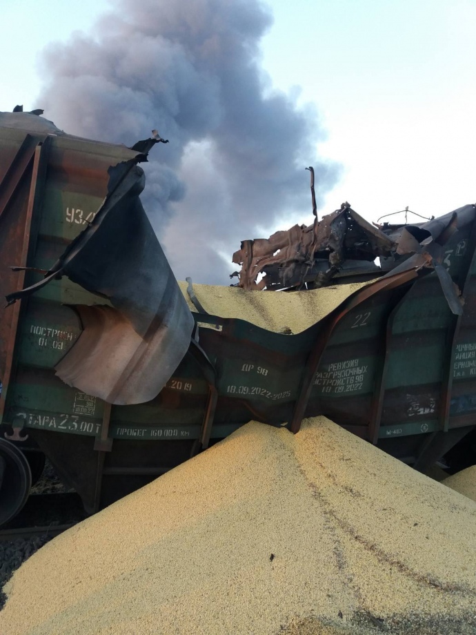 Vagões de grãos danificados no Kiev oblast. Foto: Ferrovias ucranianas