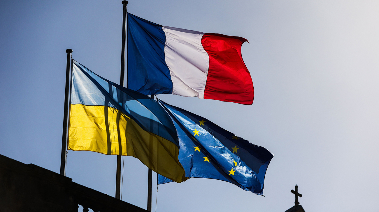 Bandeiras da Ucrânia, França e da UE. Foto: Getty Images