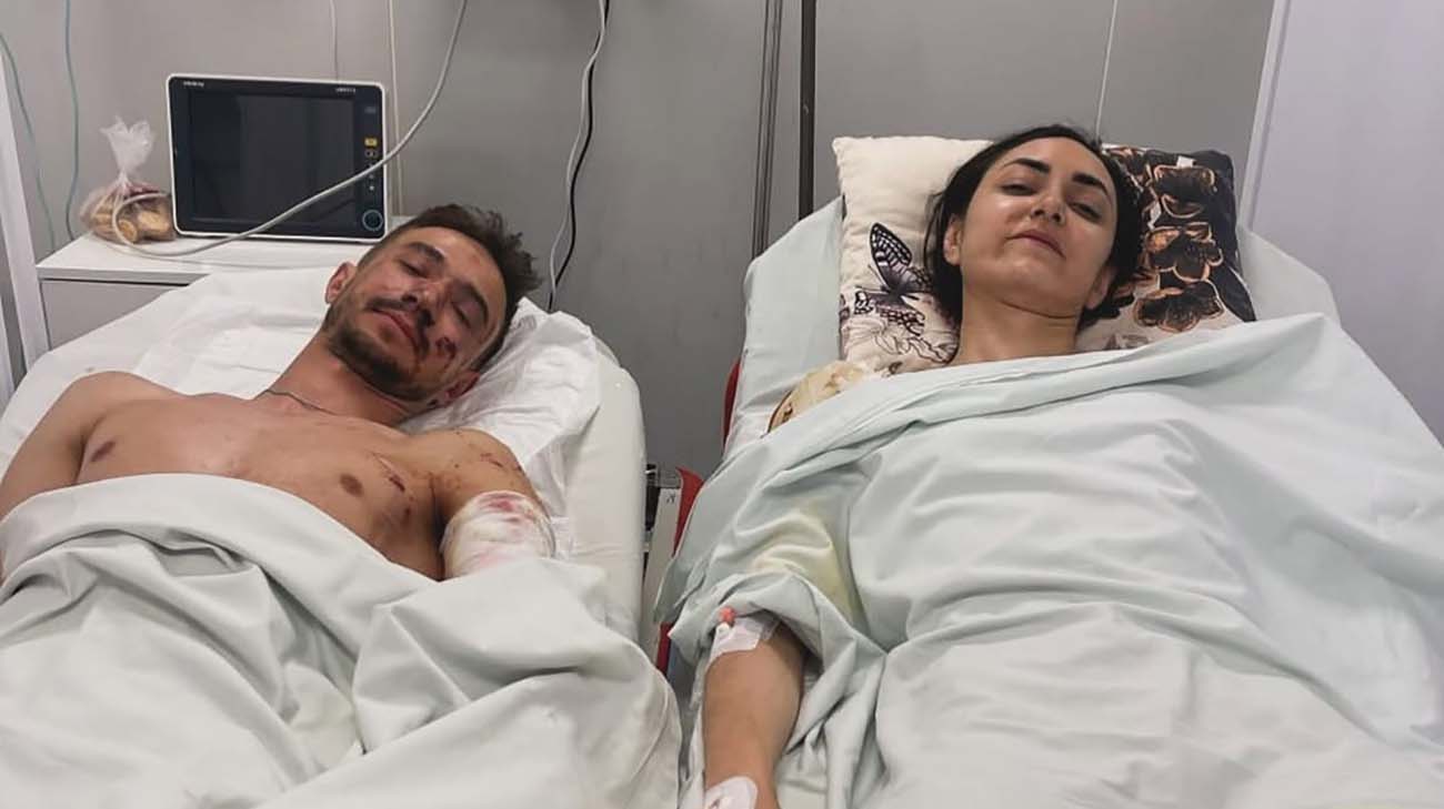 Detalhes: Na foto, ele e seu colega Inna Zhelnyk estão deitados em camas de hospital. Pavlo tem arranhões no rosto.