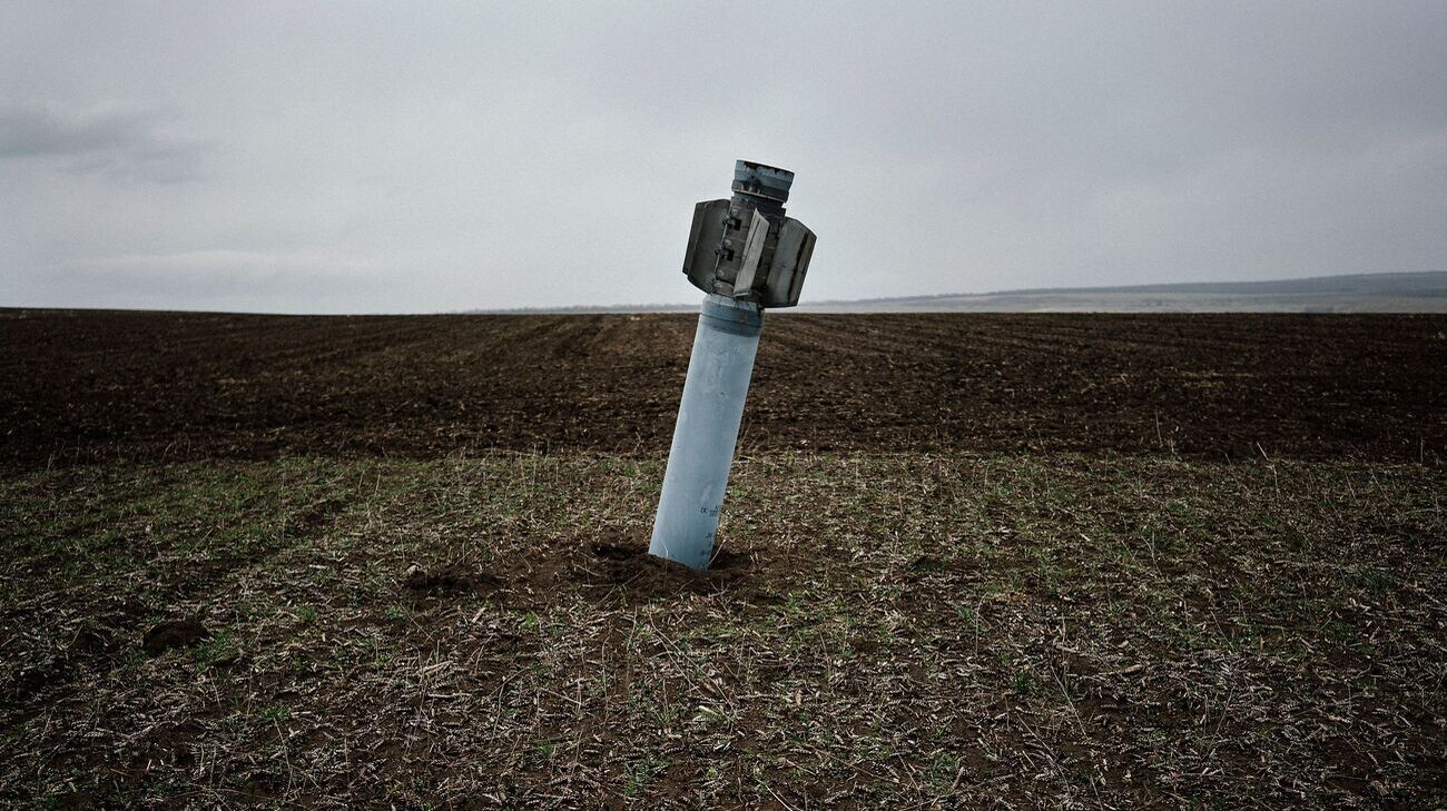 Um foguete não explodido em um campo. Foto stock: Getty Images